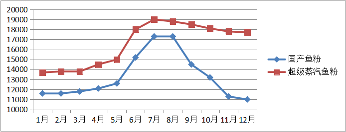從上圖可以看出秘魯北部A季魚粉供應幾乎為零時國內魚粉價格出現巨幅上揚,在7-8月處于歷史最高位,超級蒸汽魚粉一度達到19000元/噸,并處于有價無貨狀態。7月后盡管有他國魚粉增加供應,補上部分市場需求,但因魚粉蛋白偏低,對高端魚粉市場影響有限,至今為止高品質魚粉市場仍受到強勢支撐。
